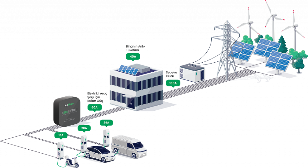 HubMaster, bağlı olduğu tesisin elektrik altyapısının anlık güç tüketimini ve elektrikli araçlardan gelen şarj gücü talebini izler ve her bir şarj ünitesine güç dağıtımını optimize eder.