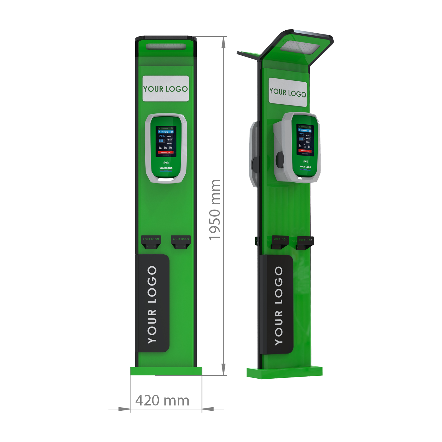 Şarj istasyonunuzdaki şarj hizmetinizi optimize etmek için WALL-E şarj ünitelerinize tek veya çift yüzlü kiosklar arasından seçim yapın. Geceleri daha iyi şarj deneyimi için LED aydınlatması mevcuttur.